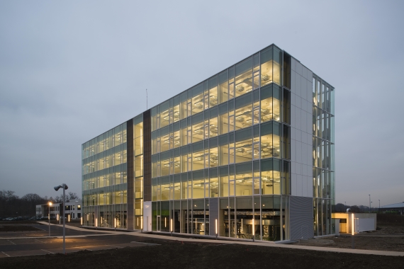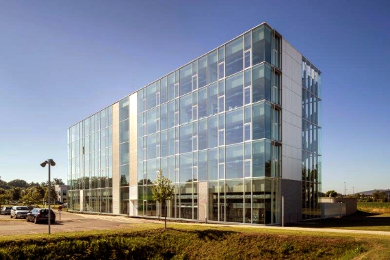 Estas empresas encontravam-se circunscritas apenas a dois outros edifícios anteriormente construídos. O Bioparc III tem ainda como fator diferenciador o facto de albergar salas de armazenagem de dissolventes químicos distintos, denominadas como ?o bunker'. A precisão técnica, a segurança e a eficiência energética foram as linhas mestras de um projeto arquitetónico com um extenso programa de mais de 3000m2 a somar aos 4500m2 ocupados pelos dois edifícios já construídos. No Bioparc III os arquitetos zelaram, desde os primeiros esquissos, pelo desenvolvimento da fachada principal, orientada a Norte, desenhada com recurso à parede-cortina AA110 da Kawneer e janelas de abertura oculta. "O edifício foi desenvolvido com uma abordagem sistemática de racionalização das superfícies e características técnicas, com base numa volumetria simples, revestida por um plano de vidro e alumínio, que promove a transparência e deixa antever toda a vida no seu interior." Uma quase total transparência unicamente pontuada pelos parapeitos das janelas em betão à vista e pelos perfis de suporte em aço pintado de branco. "Todas as instalações de equipamentos e áreas técnicas foram deixadas à vista, no piso térreo, reafirmando a natureza técnica do projeto", concluem os arquitetos. A parede-cortina AA110 assegurou o seu alto desempenho térmico e acústico, permitindo uma fácil integração das restantes soluções de serralharia de alumínio. Entre estas contam-se as janelas Kassiopee AA765 de abertura oculta, que respondem também às maiores exigências térmicas, acústicas, de segurança e estéticas, permitindo a máxima entrada de luz nos espaços. Na fachada de vidro, a Nascente, encontra-se impresso o nome do edifício: "Bioparc III". As escadas exteriores, visíveis nas laterais do edifício, são em aço galvanizado e a fachada Sul e a frontal, a Poente, foram tratadas com painéis laminados brancos e persianas que atuam como filtro solar. No seu interior, o Bioparc III estrutura-se em módulos de 260m2 cada, constituídos cada um por dois escritórios, um espaço aberto, sala de reuniões, três laboratórios de 40m2, casa de banho e varanda. Além disso, cada módulo tem chuveiro de segurança na entrada dos laboratórios, assim como todo o equipamento técnico necessário para o desenvolvimento das atividades de investigação de âmbito químico e biológico.